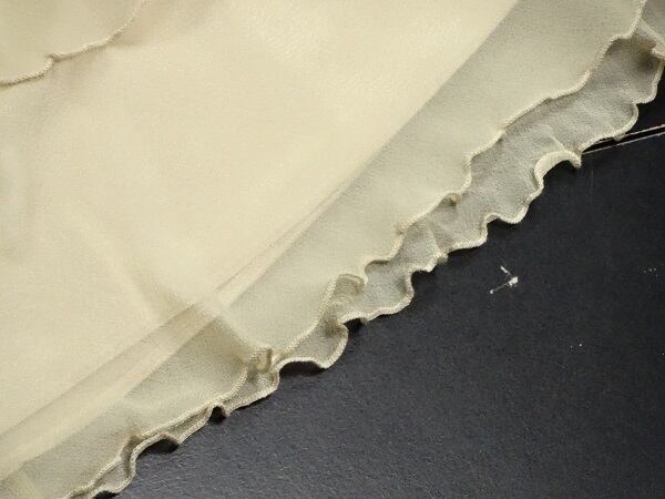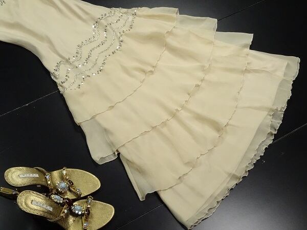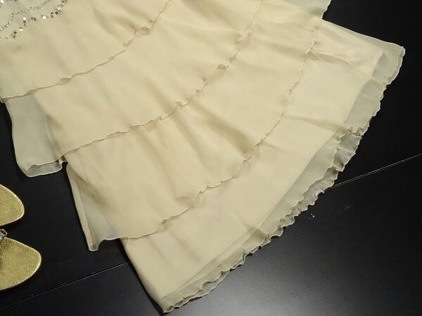 シフォンフリルパ-ティ-ドレスです。シックでやさしくエレガントな一着です。裏地有り。左サイドファスナー有。