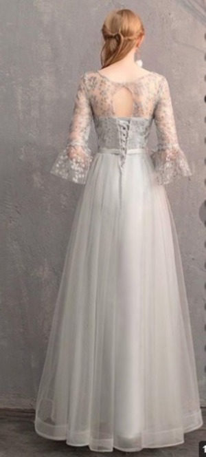 チュールサテン背中見せ編み紐掛けドレス。トップス部分のチュールには刺繍がほどこされ、胸元のチュールがデコルテラインを美しく見せています。背中側は首元がクルミボタン留めで少し下にかけて開いていて肌を見せるデザインになっており、背中の途中からウエストまでが編み紐掛け仕様、腰まではファスナーでの開閉になっています。背中編上げなので、紐の結び具合により2~3cmバストサイズに余裕があります。背中のバランスの良い空き具合がエレガントで豪華です。パーティやイベント、結婚式など、様々なシーンで、気品のある印象を与えてくれる一枚です。裏地付き。背中中央あたりからウエストにかけて編み紐掛け。腰から下ファスナ-有。胸パット付。