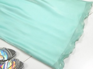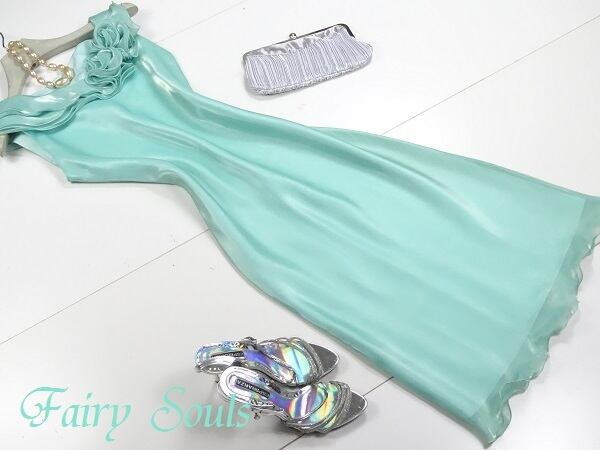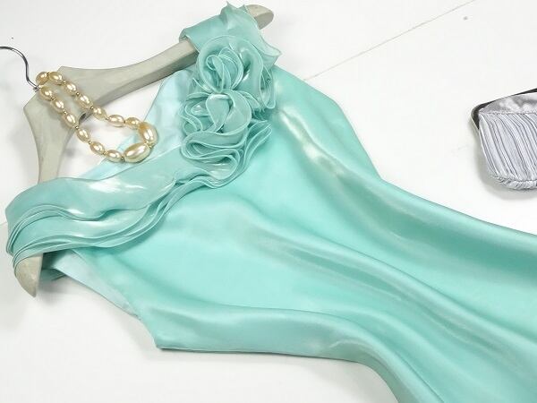 パステル系エメラルドグリ-ン光沢オ-ガンジ-のフォ-マルドレスです。少しグリ-ンがかった感じの色です。光の角度によって輝きがかわる生地とフォルムの美しさを際立たせ上品な印象をかもしだしています。裏地あり。左サイドファスナ-有。