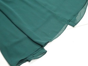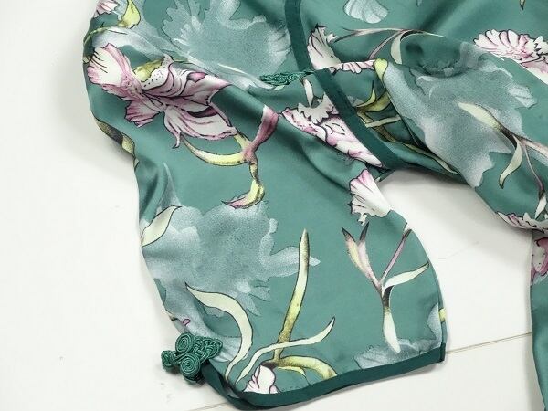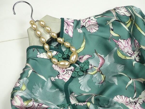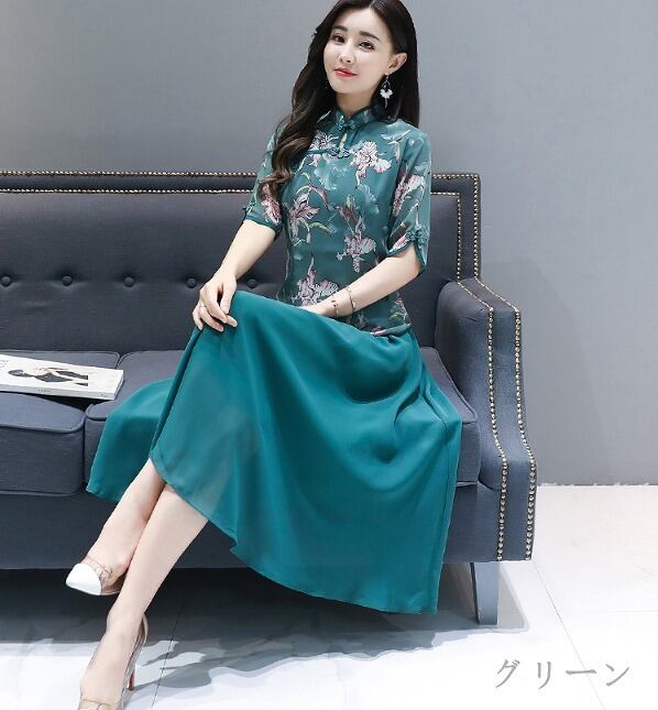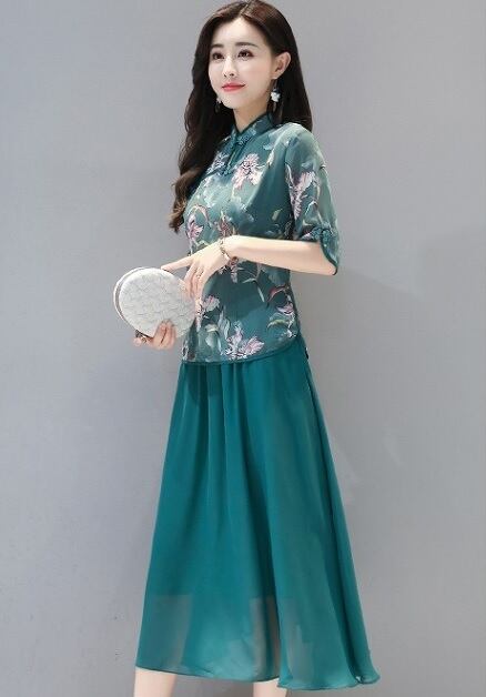 チャイナドレス風ブラウスとスカートのセットアップ。トップスはチャイナドレス風の合わせ襟。落ち着いた濃いグリーン地にやさしい色合いの花模様をプリント。スカートはウエストゴム仕様で伸縮性があり、グリーン一色で、しなやかなシフォンが女性らしさを演出。全体にシックなたたずまいを醸し出しています。ブラウスは背中ファスナー。裏地あり。
