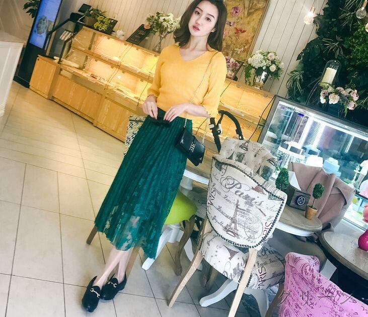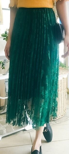 ネットチュ-ルグリーンのロングスカ-ト。落ち着いたグリーンのネット地をふんだんに仕様し、花模様をあしらった魅力的な一着。ウエストゴム仕様。ファスナ-なし。裏地付。
