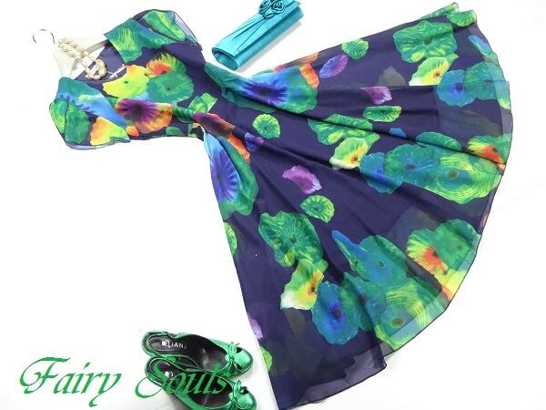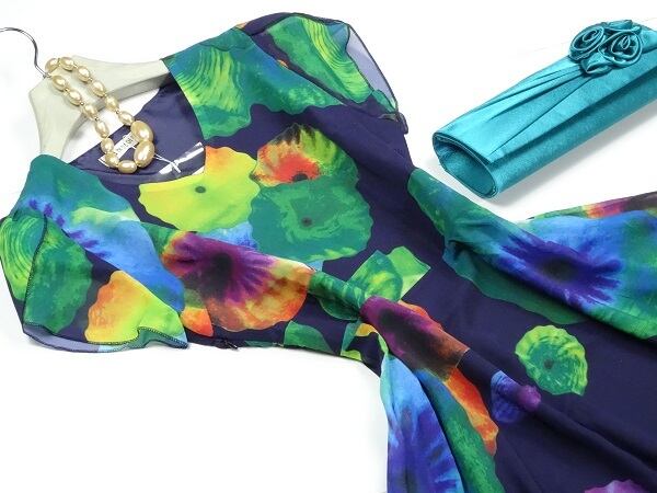 シックなフレンチ袖のマキシ丈ワンピ-ス。落ち着いた深い紺地にグリーンを基調とした色合いの大柄な模様をプリント。上品なシルエットにふっくらとした袖がキュートさをプラス。カジュアルにもフォーマルにも着用いただける魅力的な一着です。裏地有。右脇下ファスナ-有。