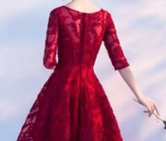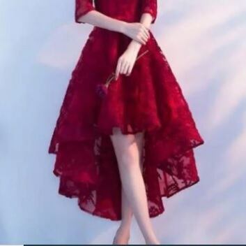 リボン刺繍赤のフィッシュテールドレス。赤のサテン地の上に、赤のリボン刺繍を施したチュールを重ねた、前と後ろで長さの違うフィッシュテールタイプのドレス。首元はゆるやかなラウンドネックで、袖は二の腕をカバーしてくれる七分袖になっています。華やかでいてエレガント。パーティや結婚式の二次会、コンサートにといろいろなシーンに活躍してくれる一枚です。背中ファスナー。裏地有。胸パッド付。