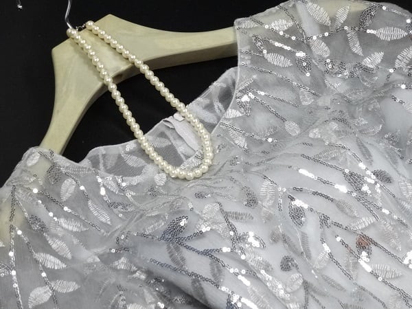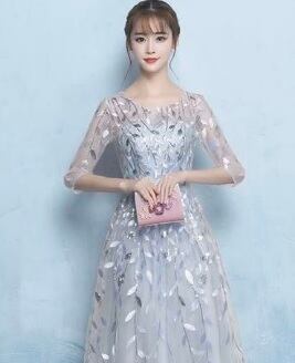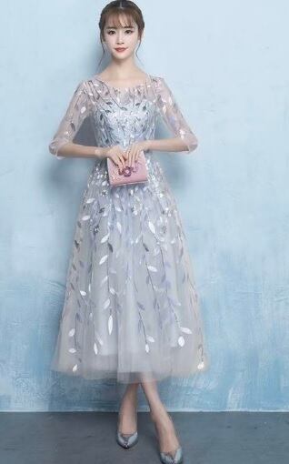 刺繍レースパーティ-ミディアムドレスです。袖やデコルテの透け感がとても美しく大人の女性を醸し出してくれるエレガントなドレスです。全体にシルバ-の刺繍とビジュ-飾りが施されデザイン性のあるスタイルがとても魅力的な一着です。全体的に優しい感じに仕上げられています。背中ファスナ-有。胸パット付き。裏地有。