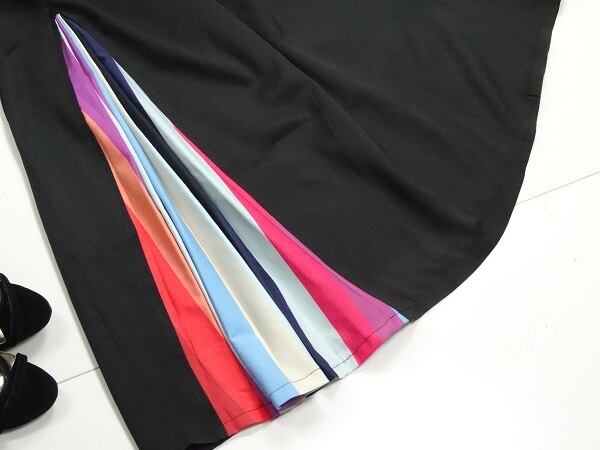 マルチカラ-プリ-ツワンピ-スです。スリット部分はカラフルなプリ-ツになっていてとてもエレガントです。背中ファスナ-あり。裏地なし。