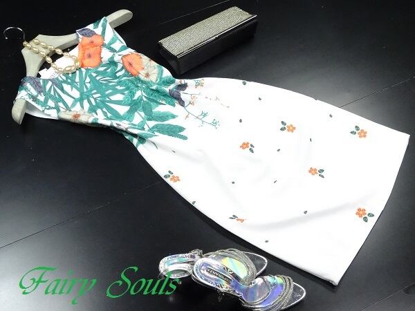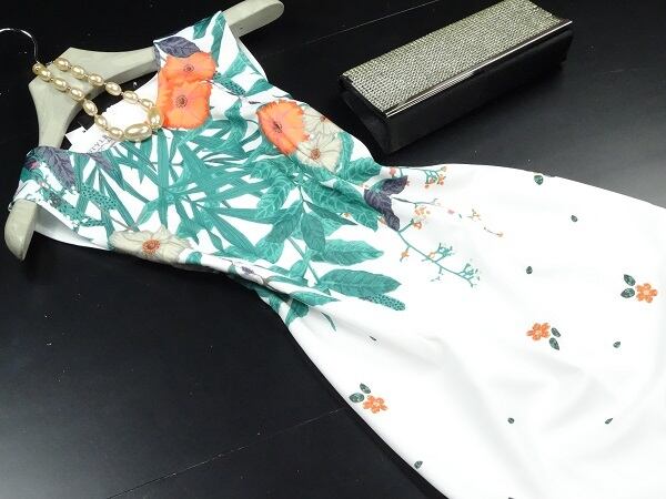 白色を基調とした緑と赤その他の花柄プリントがとても美しいワンピースです。花模様が全体を綺麗なバランスにまとめています。背中ファスナー有。裏地なし。