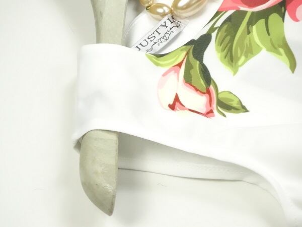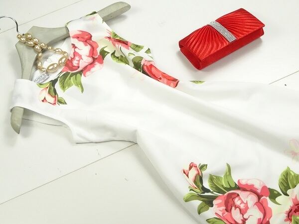 白色を基調とした緑と赤その他の花柄プリントがとても美しいワンピースです。花模様が全体を綺麗なバランスにまとめています。背中ファスナー有。裏地なし。