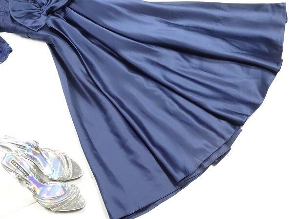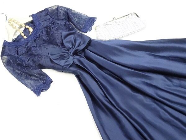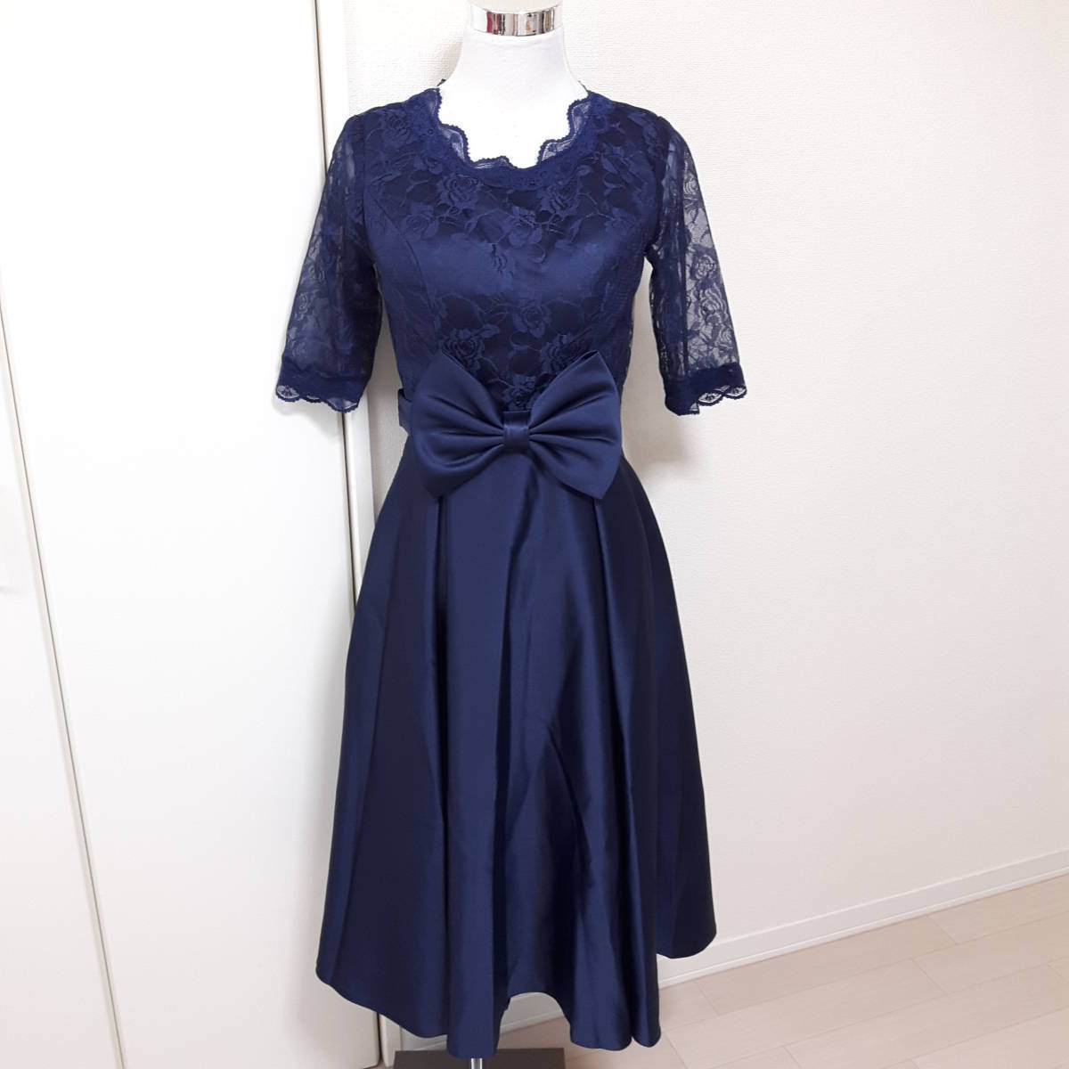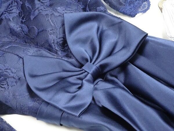 エレガントパ-ティ-ワンピ-スです。ウエストの大きなリボンがとても可愛い気品に満ちたとてもエレガントで上品なひとクラス上をいく一品です。トップス部分のレースの透け感もとても上品でエレガントです。裏地有。背中ファスナ-有。