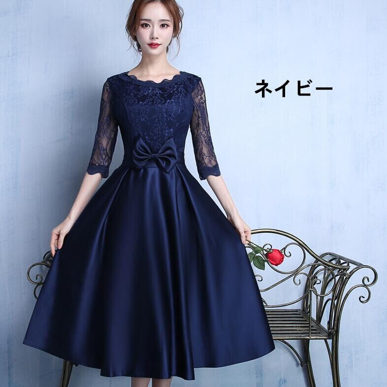 エレガントパ-ティ-ドレスです。ウエストの大きなリボンがとても可愛い気品に満ちたとてもエレガントで上品なひとクラス上をいく一品です。トップス部分のレースの透け感もとても上品でエレガントです。裏地有。背中ファスナ-有。