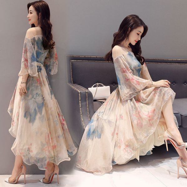 花模様のプリントフィッシュテール上質マキシ丈のワンピースです。薄い透け感がやわらかな印象を与えてくれています。バランスが良く、ピュアでフェアリーなデザインになっています。煌めく太陽の光の中でも、また新緑の爽やかな風の中でも、着る人を美しく魅せてくれる一着です。前と後ろで丈の長さが違います後ろが長いです。裏地有り。背中ファスナ-有。