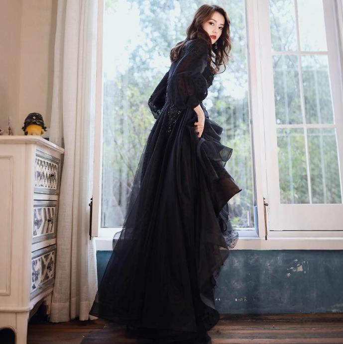 ビーズ飾りチュールの長袖ドレス。光沢のある黒のサテン地の上に、黒のチュールを重ねています。上半身には黒のビーズをちりばめ、スカート部分はサテン地の上にドット柄のチュールと無地のチュールを2重に重ねています。デザイン性のあるスタイルがとても魅力的。胸元と袖は透け感があり、ほんのり見える肌が上品。パーティやコンサートにと、華やかなシーンにふさわしい一着です。裏地付き。背中ファスナ-有。胸パット付き。チュールは2重。