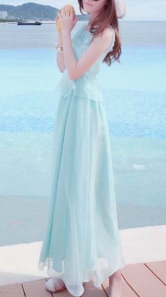 胸元花モチーフ飾りシフォンのワンピ-ス。薄い透け感がやわらかな印象を与えてくれています。バランスが良く、ピュアでフェアリーなデザインになっています。煌めく太陽の光の中でも、また新緑の爽やかな風の中でも、着る人を美しく魅せてくれる一着です。ウエストゴム仕様。ファスナーなし。裏地有り。