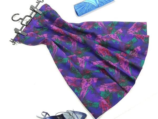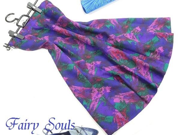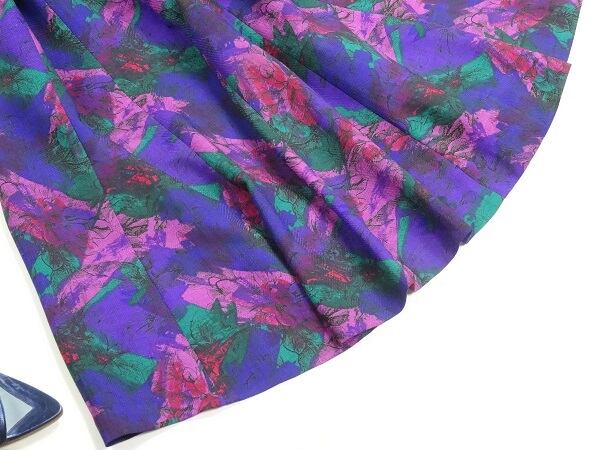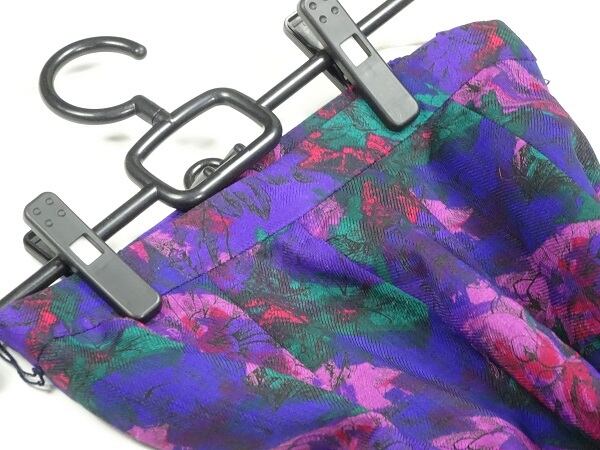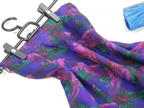 12枚はぎツイード地花模様のフレアスカ-ト 。12枚の布をつないだ緩やかなゆったりとしたフレアが、歩くたびにふんわりと揺れて上品な印象をあたえています。生地はツイード風でしっかりとしています。落ち着いた紫をベースに赤やピンク、緑といった原色で彩られた花柄情熱的な印象をプラス。ウエストは幅広ゴム仕様でサイズにゆとりがあります。左サイドファスナー。裏地付。