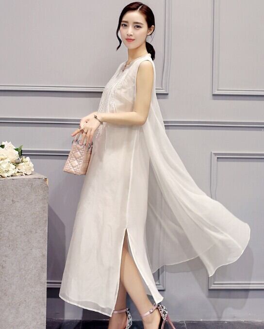 ふんわりノ-スリ-ブロングワンピースです。トップス部分は、清楚な刺繍から女性らしさを引き出しフェミニンかつロマンティックな雰囲気醸し出してくれます。シフォン素材が重ねられ、爽やかな女性本来の柔らかさや優しいイメ-ジが伝わり、動くたびに揺れる気分がとても心地良いです。背中ファスナ-有。裏地あり。