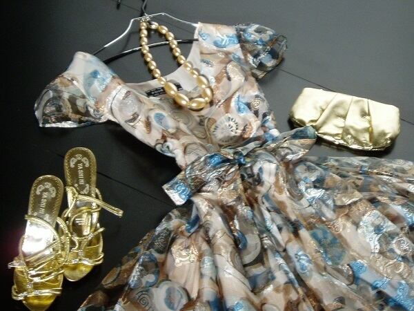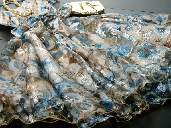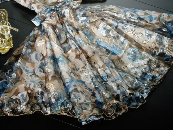 絵画のように美しい模様があしらわれた大変美しいワンピース。裾の透け感が優雅で上品な印象を与えています。ウエストで結ぶ共布のリボンがアクセントになっています。どんなシーンでも視線を独り占めしてくれる一枚です。裏地付き、サイドファスナー、ベルト取り外し可能。