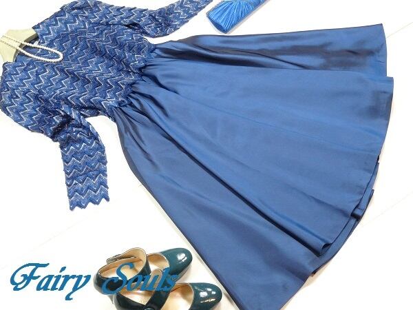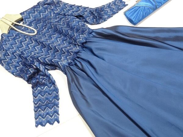 金糸刺繍レースと異素材の長袖ワンピースドレス。シックな光沢のある紺の生地に、上半身には金糸刺繍をあしらったレースを重ね、下半身は光沢のある紺のサテン地を合わせています。ウエストはゴム仕様でサイズ的にもゆとりをもって着用いただるスタイルがとても魅力的です。全体的に上品で優しい感じに仕上げられています。ちょっとおしゃれな普段着としても、またフォーマルなシーンでも活躍してくれる一着です。背中ファスナ-有。裏地付き。