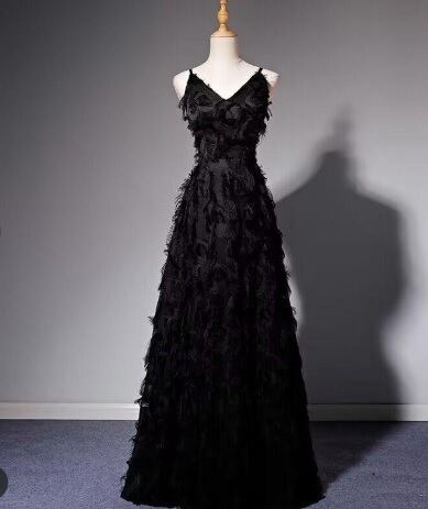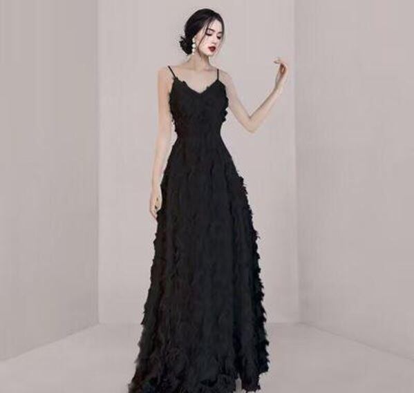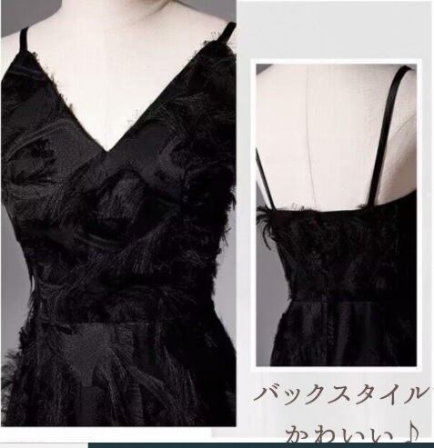 フェザー刺繡キャミソールドレス。黒地にフェザータイプの刺繍をあしらったフェミニンで清楚な印象のデザイン。パーティやイベントなど、さまざまシーンで活躍してくれる魅力的な一着です。肩ひもは長さ調整不可。背中ファスナー。裏地あり。