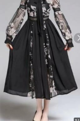 ネックリボン刺繍フリンジのワンピース。柔らかな黒の生地に上半身とスカートの一部にベージュの花刺繍をあしらったフェアリーなデザイン。首元には黒のリボンとベージュのフリンジがアクセントになっていて、袖はほんのり素肌が見える透け感が美しさを際立たせています。デートや結婚式、コンサートなどのフォーマルなシーンにもぴったりな一着です。裏地付き。右脇ファスナーあり。