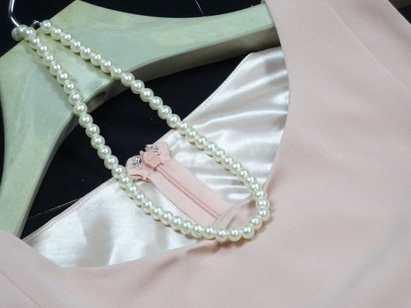 ツーピース風リボンのワンピース。ピンクカラーの生地で、上半身はワンピースの上に同布をかぶせたツーピース風になっています。ウエストのリボンを前で結びアクセントに。着る人を美しく魅せてくれる一着です。裏地付き。背中ファスナー有。※ウエスト共布リボンは取り外し不可。