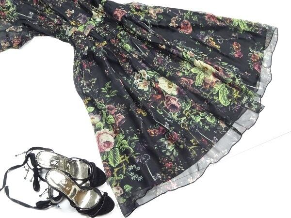 花柄シルクフレア-ワンピ-スです。軽くて着心地もとても良くこの一着で華やぎます。裏地あり。背中ファスナ-有。