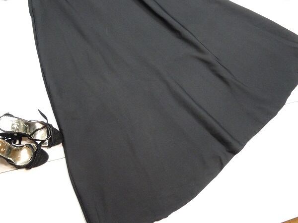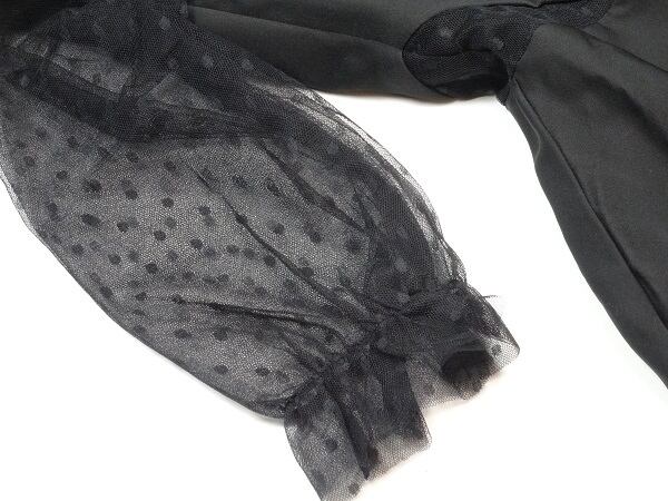 黒の長袖ロングドレス。ツイード風のしっかりとした黒の生地で裏地は光沢のあるサテン地を使用。襟元はV字にカットされており、袖はドット柄のチュールで袖先をぎゅっと絞り込みキュートな印象に。左右のウエスト部分が少しチュールのみになっているので、ほんのり素肌が見えるのがフォーマルな中にも少しばかりのセクシーさを醸し出しています。パーティやイベント、結婚式など、様々なシーンで、気品のある印象を与えてくれる一枚です。裏地有。背中ファスナ-有。胸パット付。