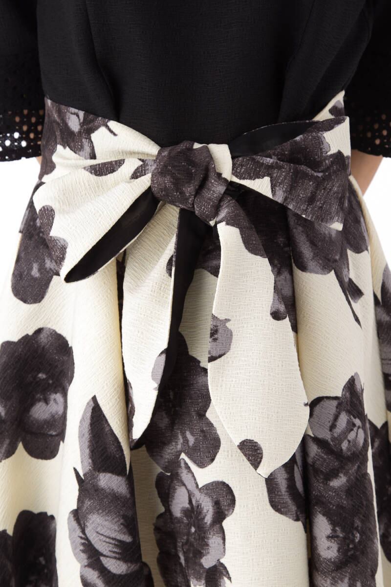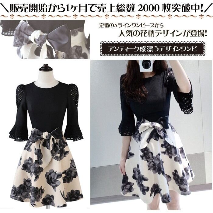 とても優美かつ綺麗な膝丈フレア-ワンピ-スです。ウエストから裾にかけてはたっぷりと生地を使用したフレア。袖のレ-スが女性らしいエレガントでフェミニンな一着です。背中ファスナ-有。裏地付。リボンベルト付。