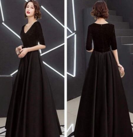 ベルベットとサテンのパ-ティードレス。トップス部分には黒のベルベット地を、スカート部分はしっかりとした黒の光沢のあるサテン地を使用し豪華な印象に。首元はV字カットで動きをもたせ、袖は肘までの七分袖で二の腕をしっかりカバー。ウエストのリボンがエレガントさの中にキュートさを加味し魅力的なデザインに仕上がっています。パーティやイベント、結婚式など、様々なシーンで、気品のある印象を与えてくれる一枚です。裏地有。背中ファスナ-有。胸パット付。