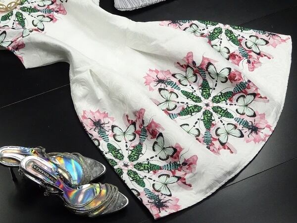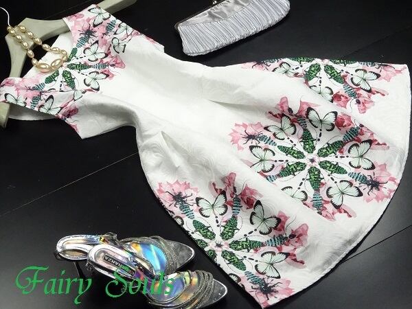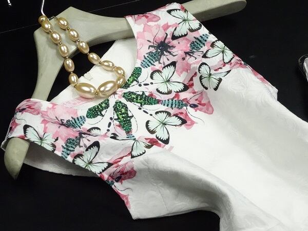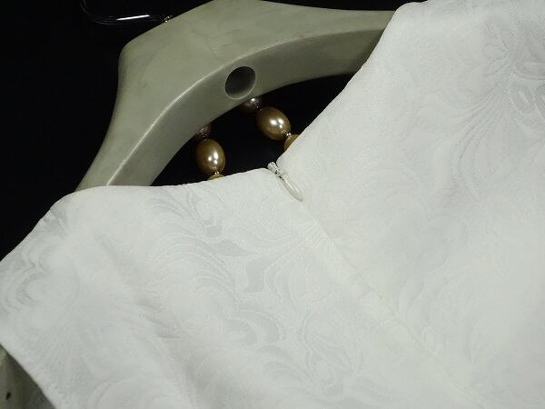 ジャガ-ド模様の生地を使用しているので、ふんわり感をキ-プし特別感を醸し出しています。背中ファスナー有。裏地なし。
