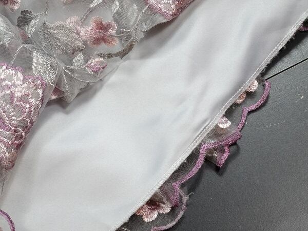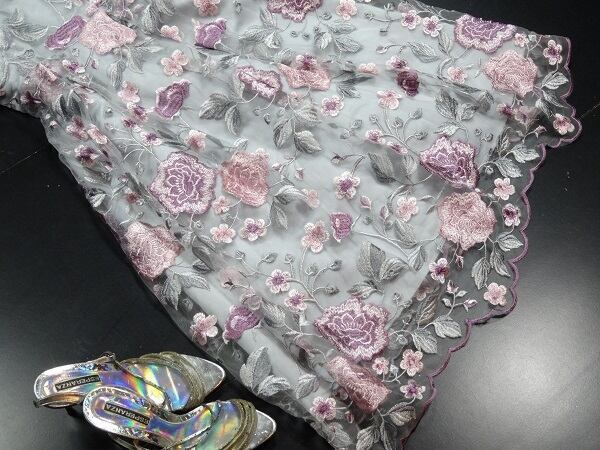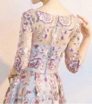 花柄刺繍オーガンジーのドレスです。グレ-の地にピンクの花柄が刺繍されたオ-ガンジ-が重ねられたエレガントな一着。デコルテライン、袖のほんのり肌見せ透け感がエレガントで魅力的な一着です。結婚式や謝恩会などに。背中ファスナー有。裏地有。胸パット付き。