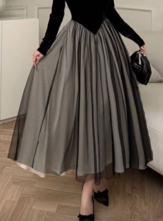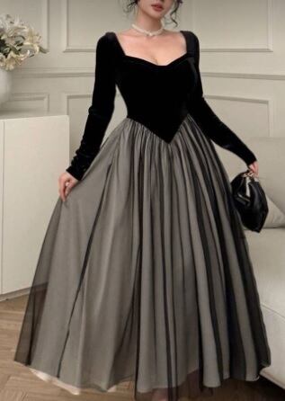 異素材パ-ティ-ミディアムドレスです。上半身は黒のベルベット素材。ウエストから裾までは、ベージュのジャージ素材の下地の上に黒のチュールを重ね、気品に満ちたとてもエレガントで上品なデザインになっています。胸元とウエストは深いV字スクエアでプリンセス風に。背中側は首元をリボンで結ぶデザインでキュートな印象。パーティ、結婚式の二次会、コンサートにと、フォーマルなシーンに大活躍してくれる一着です。裏地あり。右脇ファスナ-有。
