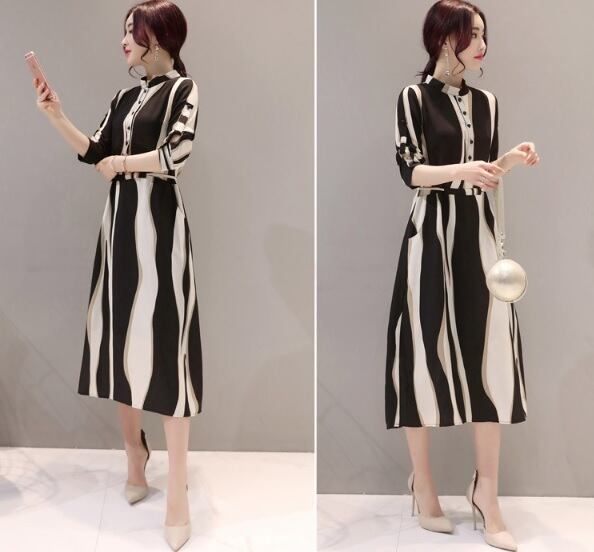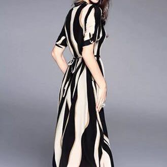 変則ストライプ前ボタン留めロング丈のワンピース。やわらかなシフォン地に、黒、シャンパンゴールド、白で波のようなストライプをプリント。スタンドカラーに、前ウエストまでをボタン留め。シックで上品な女性を表現してくれています。パーティやイベント、コンサート、結婚式にと、さまざまシーンで活躍してくれる大人の一着。右脇下ファスナー有。スカート部分裏地付。紐ベルト付。