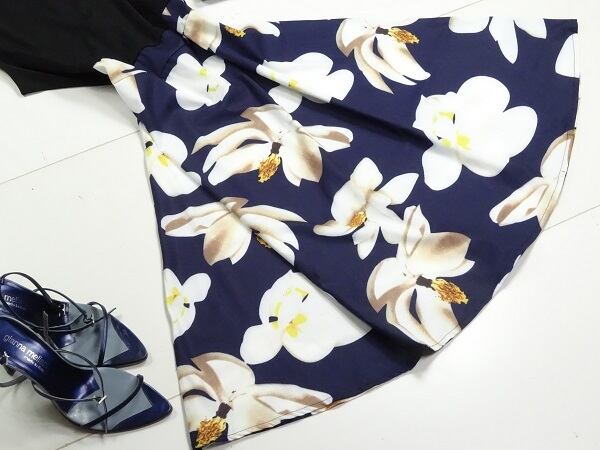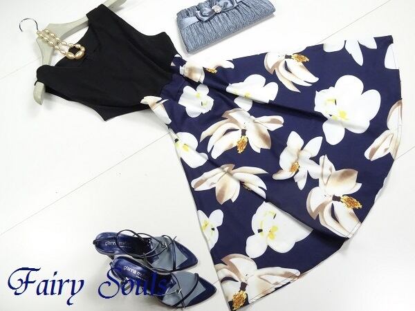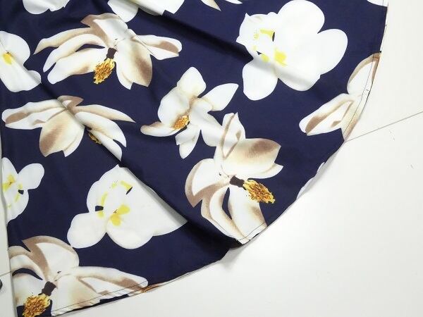 花柄プリントがとても美しいノースリ-ブワンピースです。花模様がスカ-ト部分全体を綺麗なバランスにまとめています。背中ファスナー有。裏地なし。