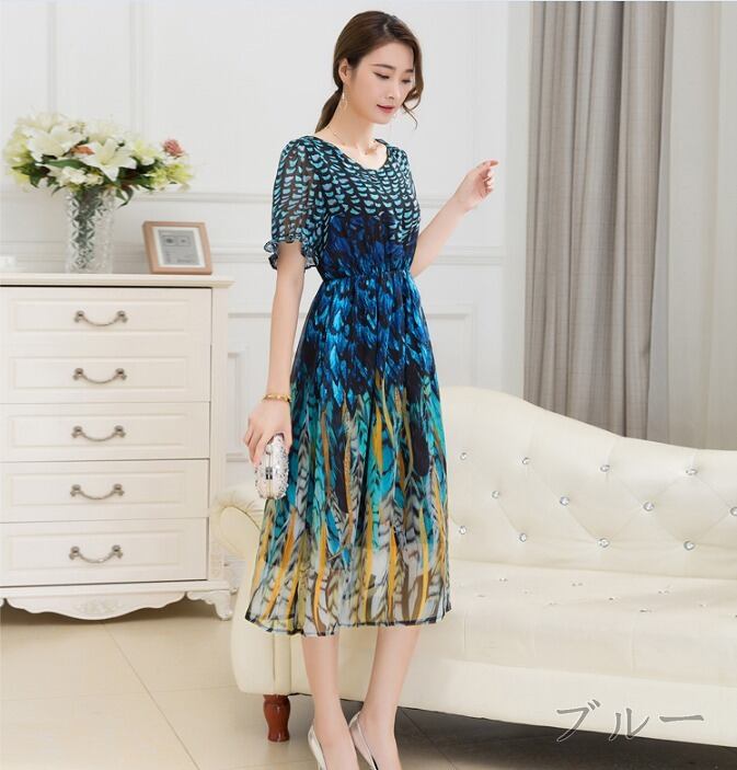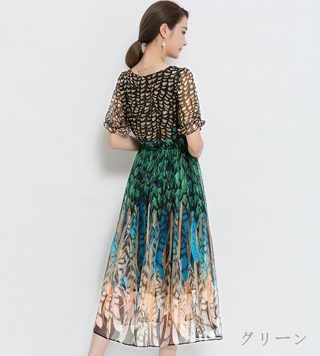 半袖フリルフェザー模様のワンピース。やさしいV字の襟に透け感のある軽やかなフリル飾りのついた袖。ウエストはゴム仕様で伸縮性があり、サイズに余裕をもって着用いただけます。動くたびに、しなやかで軽やかなシフォンが風に揺れ、フェミニンな印象を与えてくれます。バランスが良く、ピュアでフェアリー。煌めく太陽の光の中でも、また新緑の爽やかな風の中でも、着る人を美しく魅せてくれる一着です。裏地有り。ファスナーなしのかぶるタイプ。