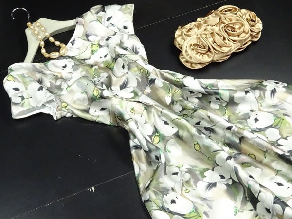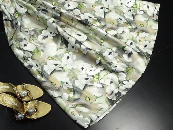 シックな花柄が全体にプリントされたミモレ丈フレア-ワンピ-スです。適度の張り感が楽しめとても華やかな印象を与えてくれる一着です。パ-ティ-やお呼ばれの席にピッタリです!!裏地なし。背中ファスナ-有。