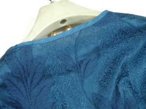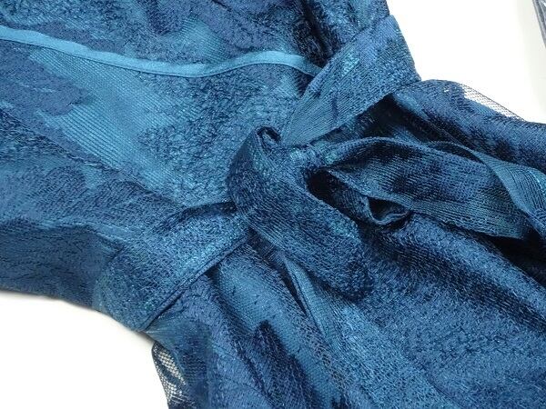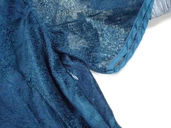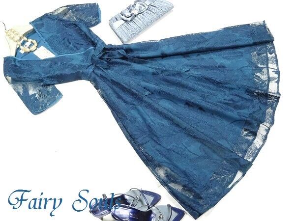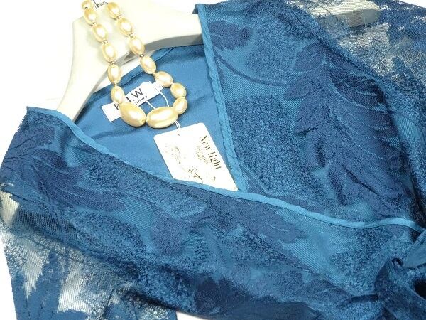 透け感が美しいVネックレース仕様のワンピ-ス。トップス部分はカシュクール風のVネック仕様。ウエストで切り返しが入り、裾までボタニカル柄をあしらったレース仕立ての生地をたっぷりと使用。ボリュームを出し華やかな印象に。袖は透け感があり、二の腕がほんのりと見え、品の良いセクシー感をかもしだしています。ウエストを共布のベルトリボンでキュッと絞るデザイン。シックでやさしくエレガントな一着です。右脇ファスナーあり。裏地付き。