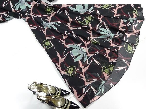 ボタニカル柄がシックなフィッシュテールのワンピース。黒地に落ち着いた色合いのボタニカル柄をプリント。ゆるやかなラウンドネックと、透け感のあるしなやかな袖。後ろが少し長くなっているフィッシュテールとのバランスが良く、ピュアでフェアリーなデザインになっています。煌めく太陽の光の中でも、また新緑の爽やかな風の中でも、着る人を美しく魅せてくれる一着です。裏地有り。背中ファスナ-有。