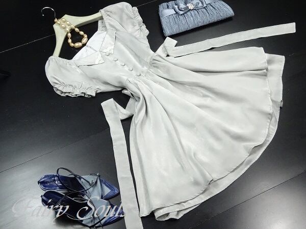 角度によって輝きが変わる光沢感のある素材でとてもお洒落でしぐさを優雅に見せてくれます。可愛いデザインのシフォンプリンセスワンピ-スです。背中ファスナ-有。裏地有。