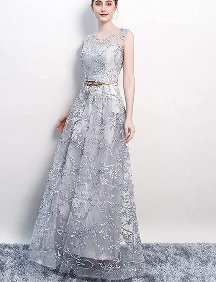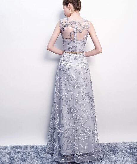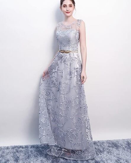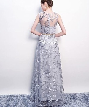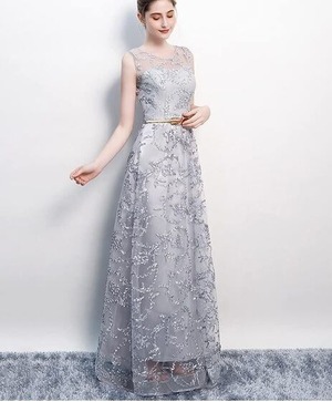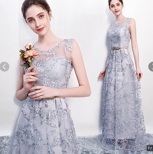 立体刺繍レースパーティ-ロングドレスです。デコルテの透け感がとても美しく大人の女性を醸し出してくれるエレガントなロングドレスです。全体に銀糸の刺繍が施されデザイン性のあるスタイルがとても魅力的な一着です。全体的に優しい感じに仕上げられています。背中ファスナ-有。胸パット付き。裏地有。ブロンズベルト付き。