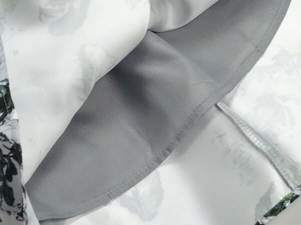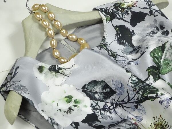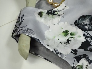 花柄サテンノースリ-ブワンピ-スです。色が綺麗で生地も高級感があります。セレブなデザインです。シンプルな飽きのこない着まわせる一着です。裏地有。背中ファスナ-有。
