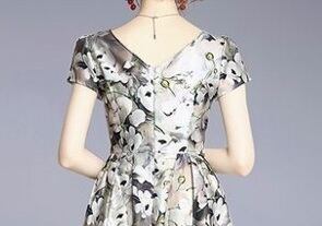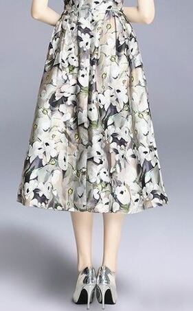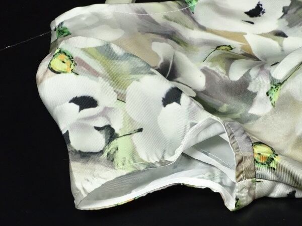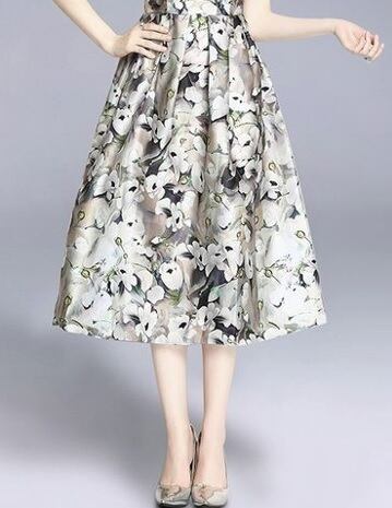 シックな花柄が全体にプリントされたミモレ丈フレア-ワンピ-スです。適度の張り感が楽しめとても華やかな印象を与えてくれる一着です。パ-ティ-やお呼ばれの席にピッタリです!!裏地なし。背中ファスナ-有。