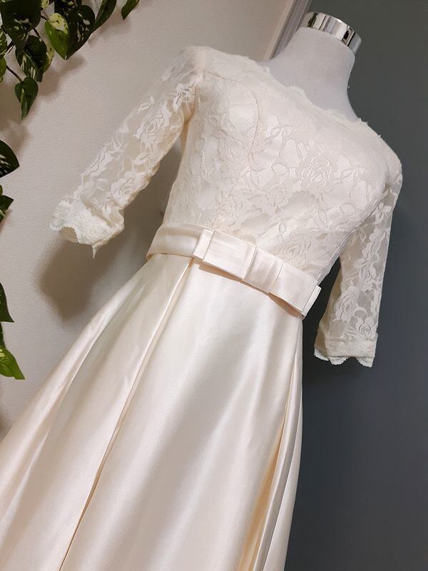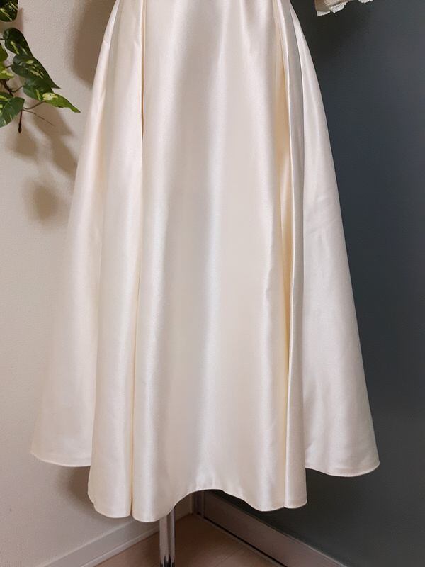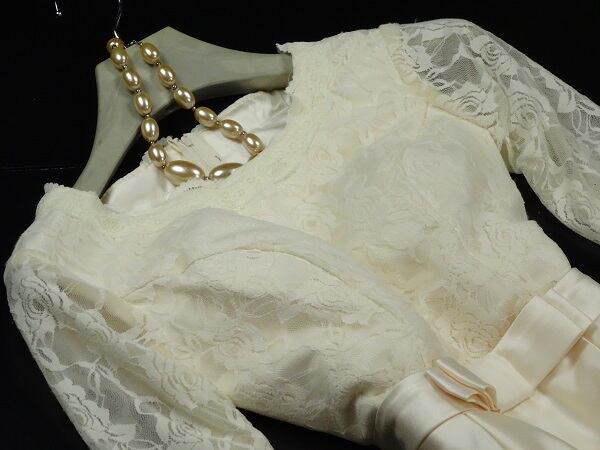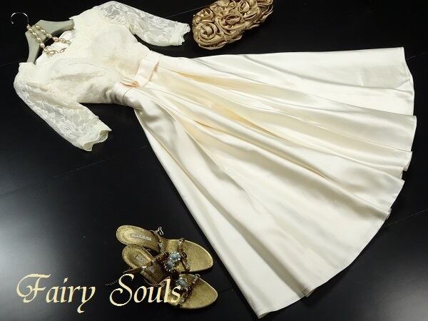 エレガントパ-ティ-ワンピ-スです。気品に満ちたとてもエレガントで上品なひとクラス上をいく一品です。トップス部分のレースの透け感もとても上品でエレガントです。裏地有。背中ファスナ-有。
