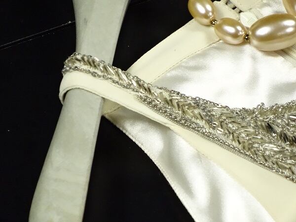 胸元飾りがフェミニンで豪華なワンピースです。お洒落度バツグンで女性らしさを演出した一品です。裏地付。背中ファスナ-有。