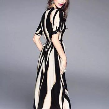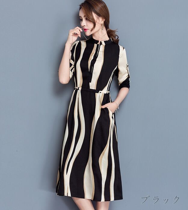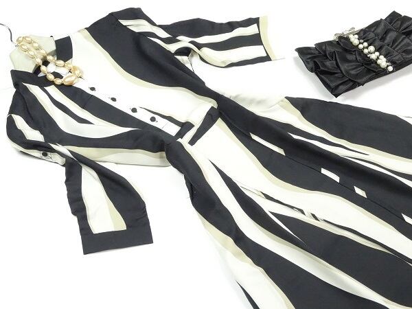 変則ストライプ前ボタン留めロング丈のワンピース。やわらかなシフォン地に、黒、シャンパンゴールド、白で波のようなストライプをプリント。スタンドカラーに、前ウエストまでをボタン留め。シックで上品な女性を表現してくれています。パーティやイベント、コンサート、結婚式にと、さまざまシーンで活躍してくれる大人の一着。右脇下ファスナー有。スカート部分裏地付。紐ベルト付。