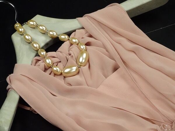 3Wayスモ-クピンクのフォルダ-ネック・ドルマン袖ワンピ-スです。切替部分の花飾りが豪華です。裏地あり。左サイドファスナ-有。肩紐調整可。