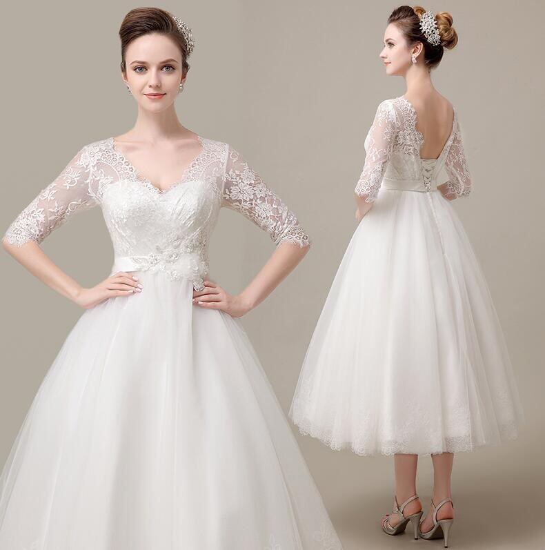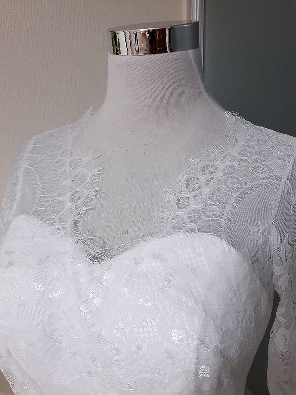 ミモレ丈刺繍レ-スウエディングドレスです。フロントの透け感とオ-プンバックがセレブリティ-な雰囲気でウエストからシフォン素材が広がりとても美しく魅せてくれます。背中ファスナー有。裏地あり。