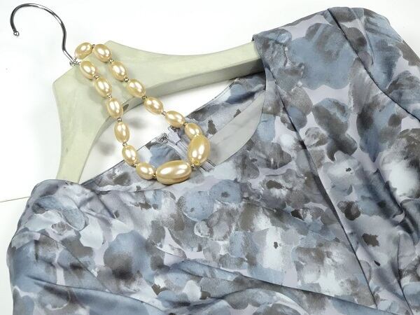身生地には抽象的な花柄がプリントされ、肩付近からウエストにかけクロスされた女性らしいデザインになっています。シックだけれど華やかな印象もあわせ持つ魅力的な一着です。背中ファスナ-有。裏地有。