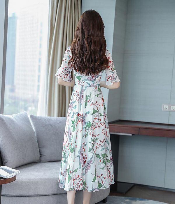 花柄マキシ丈シフォンフレア-ワンピ-スです。ウエストから裾にかけてはたっぷりと生地を使用したフレア-。白地にぼかした花模様をプリント。エレガントでフェミニンな一着です。右サイドファスナ-有。裏地付。