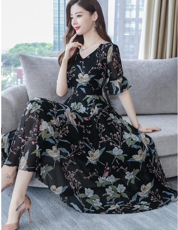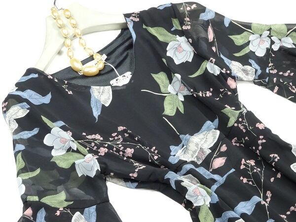 花柄マキシ丈シフォンフレア-ワンピ-スです。ウエストから裾にかけてはたっぷりと生地を使用したフレア-。黒地に花模様をプリント。エレガントでフェミニンな一着です。右サイドファスナ-有。裏地付。