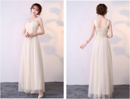 パーティ-チュールロングドレスです。やさしいシャンパン色のチュールと同色のサテン地の豪華な組み合わせ。背中側はシャーリング(ゴム仕様)になっているので伸縮性があります。品の良いフェミニンなデザイン。ほんのりとした透け感が上品な女性を表現してくれています。パーティやイベント、コンサート、結婚式にと、さまざまシーンで活躍してくれる美しい一着。右脇下ファスナー。裏地付。