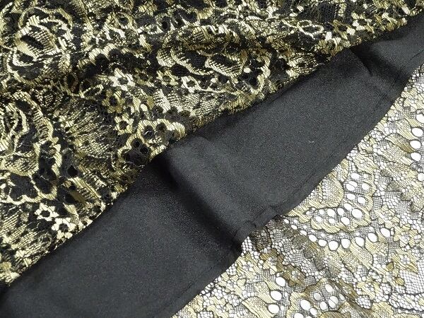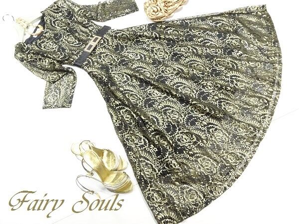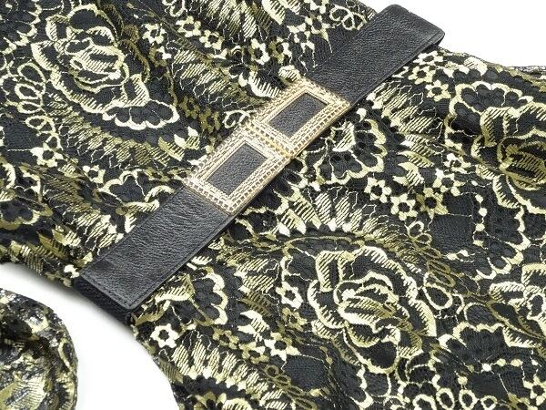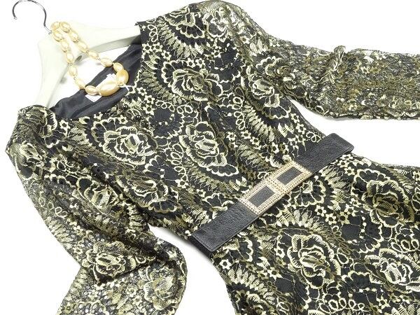 総レ-ス金糸刺繍マキシ丈ワンピ-スです。全体的に黒の総レ-スに金糸が刺繍されたとても豪華かつシックでやさしくエレガントな一着です。右脇ファスナーあり。裏地付き。ベルト付。